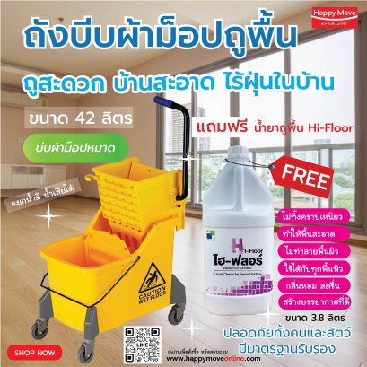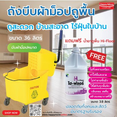 ตัวถังผลิตจากพลาสติก มือจับหุ้มด้วยยาง ใช้งานไม่เจ็บมือ มีคันโยกบีบผ้าม็อปให้แห้ง ไม่ต้องใช้มือบีบ