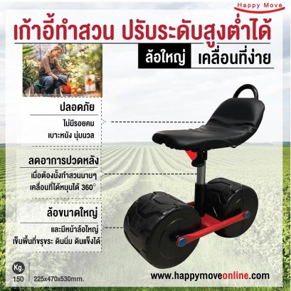 รถเข็นสำหรับทำสวน ติดล้อเคลื่อนที่ได้ ไม่ต้องลุกนั้งบ่อยๆ ให้ปวดหลังหรือเมื้อยตัวปลอดภัยไร้รอยคม หมุนคล่องตัว 360 องศา ใช้งานง่ายทนแดดทนฝน เคลื่อนที่ได้แม้ขณะนั้งอยู่ เบาะนุ่มนั้งสบาย ปรับระดับความสูงต่ำได้
