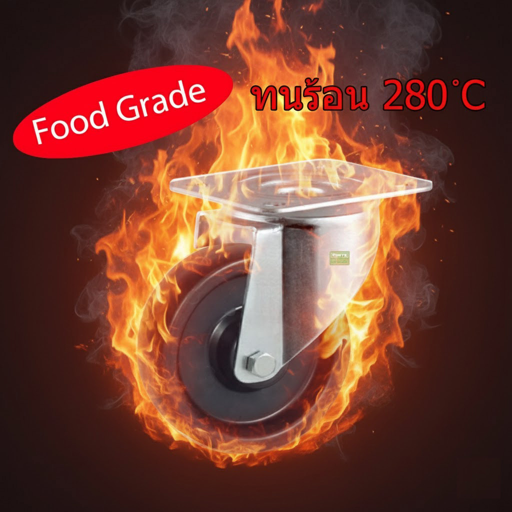 80,100มม.แป้นหมุนมีเบรก ลูกล้อทนความร้อน TENTE เยอรมัน ทนได้ถึง 280 องศา มาตรฐาน Food Grade มีแบบแป้นหมุน แป้นตาย และมีเบรก สำหรับอุตสาหกรรมอาหารและเตาอบ.