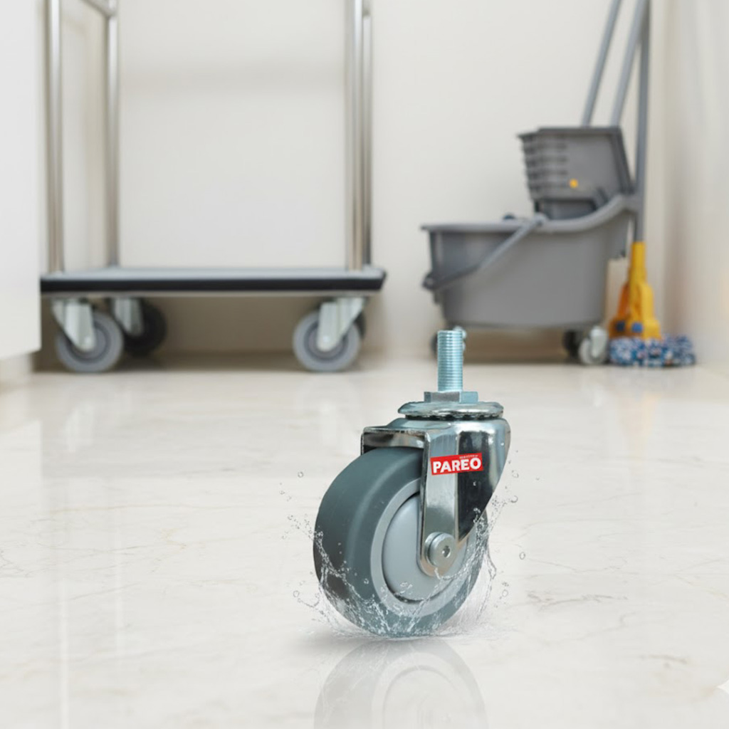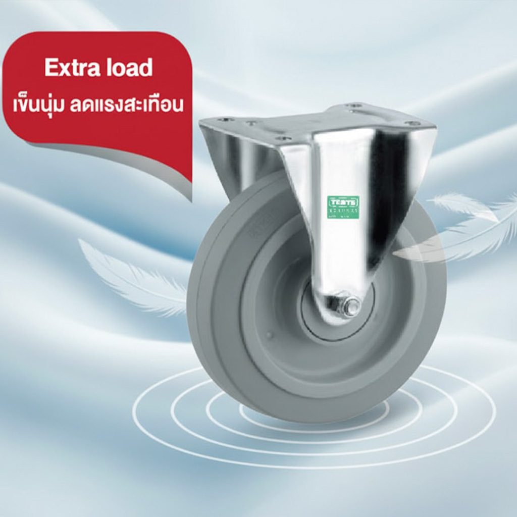 รูหมุน ขนาด100,125มม.ลูกล้อยางซินเทธิค ป้องกันสนิม (Anti-Rust) ลดเสียงดัง >40% น้ำหนักเบามาตรฐาน DIN EN ISO 9001 เหมาะสำหรับโรงแรม งานบริการ