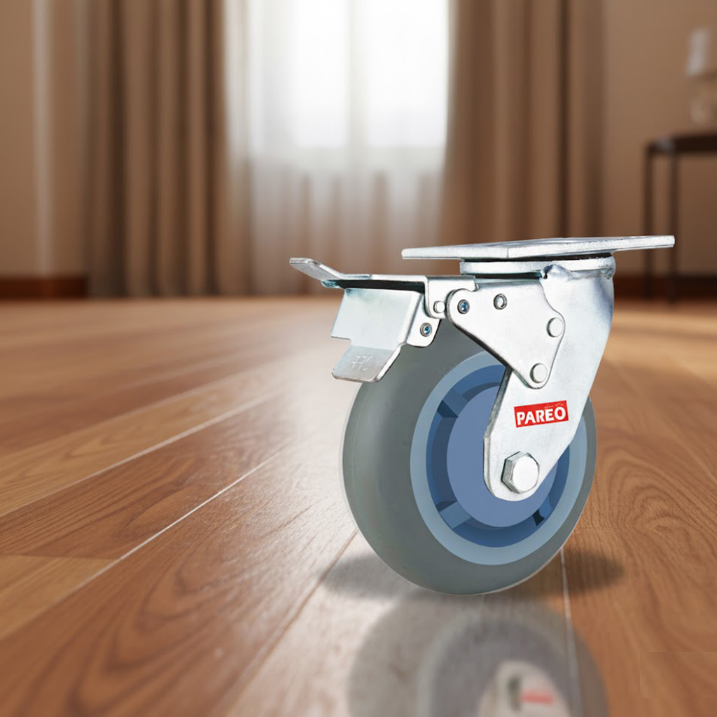 รูหมุนมีเบรก ขนาด100,125มม.ลูกล้อยางซินเทธิค ป้องกันสนิม (Anti-Rust) ลดเสียงดัง >40% น้ำหนักเบามาตรฐาน DIN EN ISO 9001 เหมาะสำหรับโรงแรม งานบริการ
