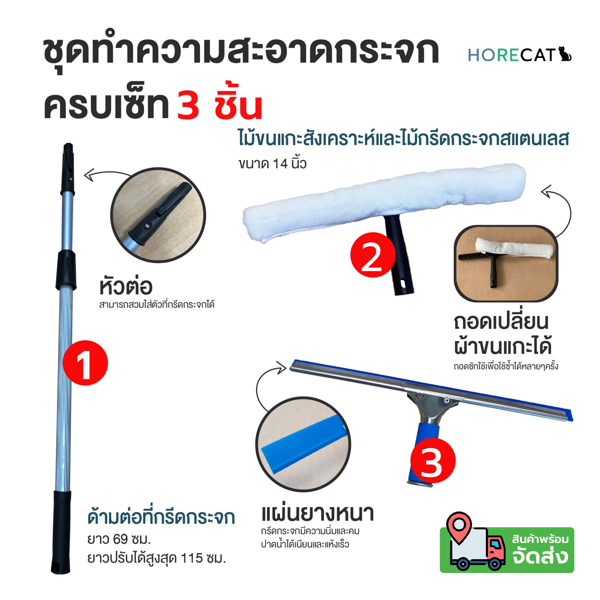 ที่กรีดกระจกสเตนเลส ชุดทำความสะอาดกระจก Horecat ครบเซ็ท 3 ชิ้น ขนาด 14 นิ้ว ด้ามต่อปรับได้ 115 ซม. คุณภาพสูง ทำความสะอาดที่สูงได้อย่างมืออาชีพ